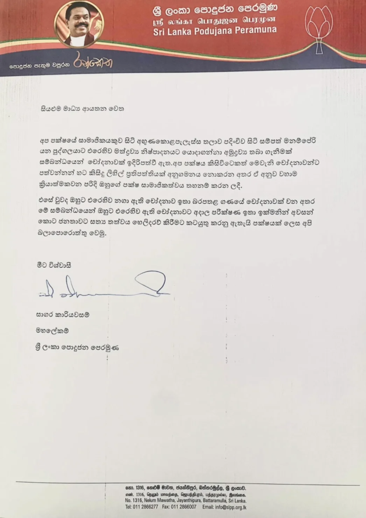 Homeදේශීය පුවත් දේශීය පුවත් පද්මෙගේ බඩු හංගගෙන ඉඳලා පොහොට්ටුවේ නම කැත කළ සම්පත් පොහොට්ටුවෙන් පන්නයි By TopNewsLK September 6, 2025 0 212 FacebookTwitterPinterestWhatsApp ශ්රි ලංකා පොදුජන පෙරමුණේ හිටපු මන්ත්රී සම්පත් මනම්පේරිගේ පක්ෂ සාමාජිකත්වය අත්හිටුවිමට එම පක්ෂය තීරණය කර තිබේ. Share FacebookTwitterPinterestWhatsApp Previous articleපොහොට්ටු මන්ත්රී සම්පත් මනම්පේරි අත්අඩංගුවටNext articleසිම්බාබ්වේට ලකුණු 80ක පහසු ඉලක්කයක් TopNewsLK Related Articles දේශීය පුවත් රට තුළ පිරිසිදු ක්රීඩාවක් ඇති කරනවා – සුගත් තිලකරත්න දේශීය පුවත් ආසියානු යටිතල පහසුකම් ආයෝජන බැංකුවේ (AIIB) සභාපතිවරයා ඇතුළු පිරිසක් ජනපති හමුවෙයි දේශීය පුවත් ජනපති සහ IMF නියෝජිතයන් අතර සාකච්ඡාවක් LEAVE A REPLY Cancel reply Comment: Please enter your comment! Name:* Please enter your name here Email:* You have entered an incorrect email address! Please enter your email address here Website: Save my name, email, and website in this browser for the next time I comment. Stay Connected0FansLike0FollowersFollow22,700SubscribersSubscribe - Advertisement - Latest Articles දේශීය පුවත් රට තුළ පිරිසිදු ක්රීඩාවක් ඇති කරනවා – සුගත් තිලකරත්න දේශීය පුවත් ආසියානු යටිතල පහසුකම් ආයෝජන බැංකුවේ (AIIB) සභාපතිවරයා ඇතුළු පිරිසක් ජනපති හමුවෙයි දේශීය පුවත් ජනපති සහ IMF නියෝජිතයන් අතර සාකච්ඡාවක් දේශීය පුවත් ස්ථානාධිපතිවරු 20ක් ඇතුළු පොලිස් පරීක්ෂකවරු 32කට මාරුවීම් දේශීය පුවත් ප්රබල අකුණු පිළිබඳ අවවාදාත්මක නිවේදනයක් Load more
