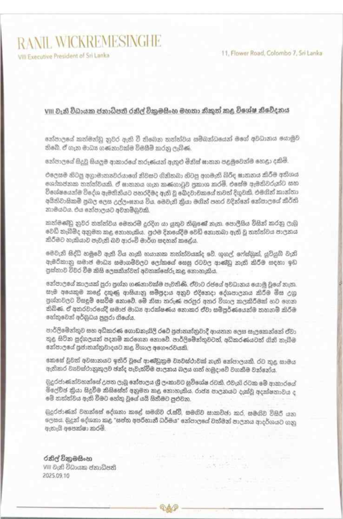 නේපාලයේ කත්මන්ඩු නුවර ඇති වී තිබෙන තත්ත්වය සම්බන්ධයෙන් හිටපු ජනාධිපති රනිල් වික්රමසිංහ විශේෂ නිවේදනයක් නිකුත් කර තිබෙනවා.